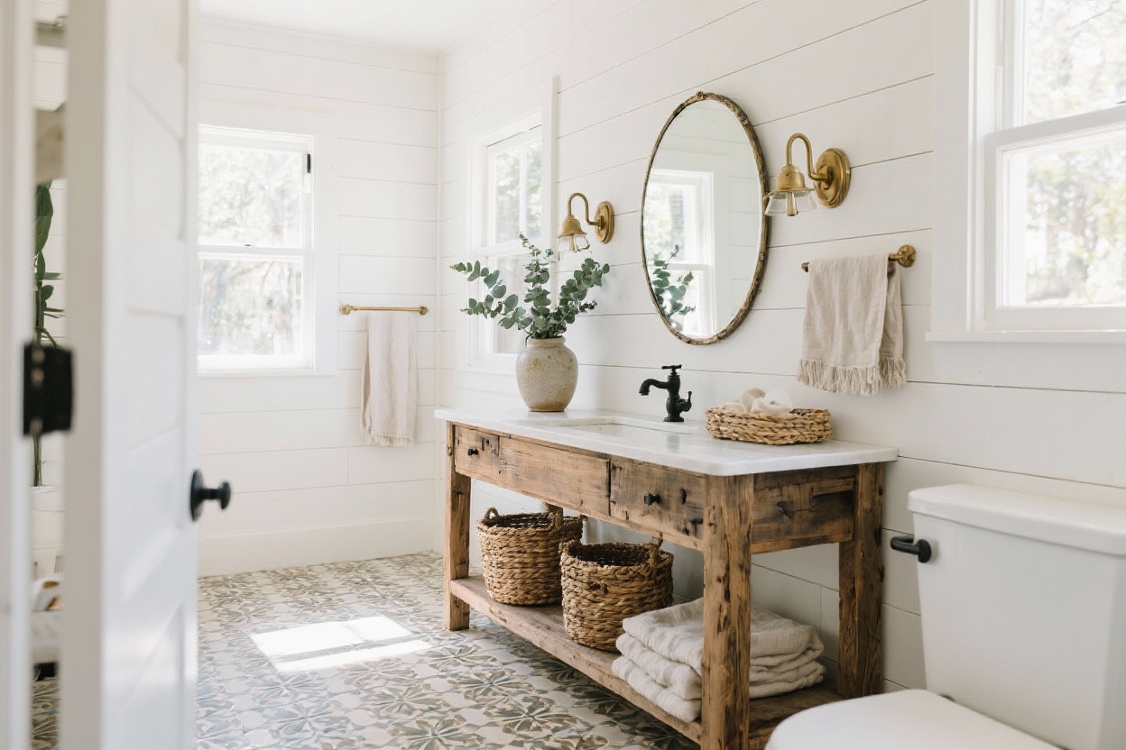 - Reclaimed wood shelves: Style with small baskets, vintage jars, and rolled hand towels. Bonus points for a potted plant.
